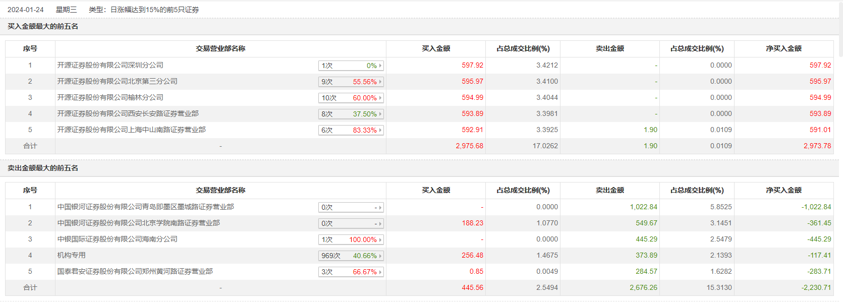 1月24日,中铁装配今日涨停,全天换手率达8.08%,振幅达19.82%。龙虎榜数据显示,营业部席位合计净买入743.07万元。其中,机构买入256.48万元,卖出373.89万元,合计净卖出117.41万元。此外,开源证券深圳分公司、开源证券北京第三分公司分别买入597.92万元、595.97万元;中国银河证券青岛即墨区墨城路证券营业部、中国银河证券北京学院南路证券营业部分别卖出1022.84万元、549.67万元。