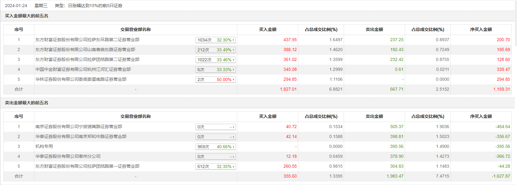 1月24日,ST易联众今日涨停,全天换手率达15.05%,振幅达20.34%。龙虎榜数据显示,营业部席位合计净卖出468.57万元。其中,机构合计净卖出395.56万元。此外,东方财富证券拉萨东环路第二证券营业部、东方财富证券山南香曲东路证券营业部分别买入437.95万元、388.12万元;南京证券宁波锦寓路证券营业部、华泰证券南京郑和中路证券营业部分别卖出505.37万元、398.81万元。