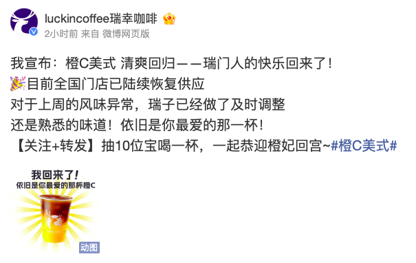 瑞幸咖啡:橙C美式陆续恢复供应,已就上周风味异常做调整