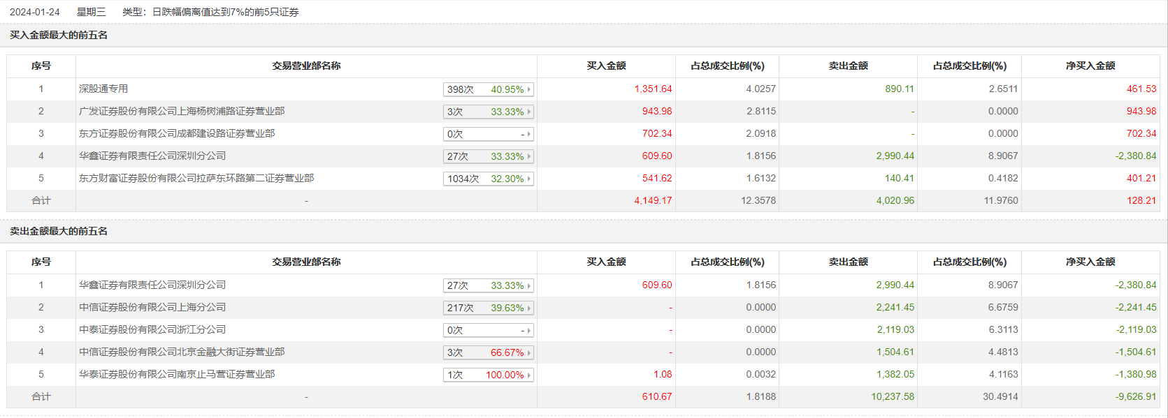 1月24日,华孚时尚今日跌8.58%,全天换手率达5.73%,振幅达9.38%。龙虎榜数据显示,营业部席位合计净卖出7117.86万元。其中,华鑫证券深圳分公司、中信证券上海分公司分别卖出2990.44万元、2241.45万元;深股通专用、广发证券上海杨树浦路证券营业部分别买入1351.64万元、943.98万元。