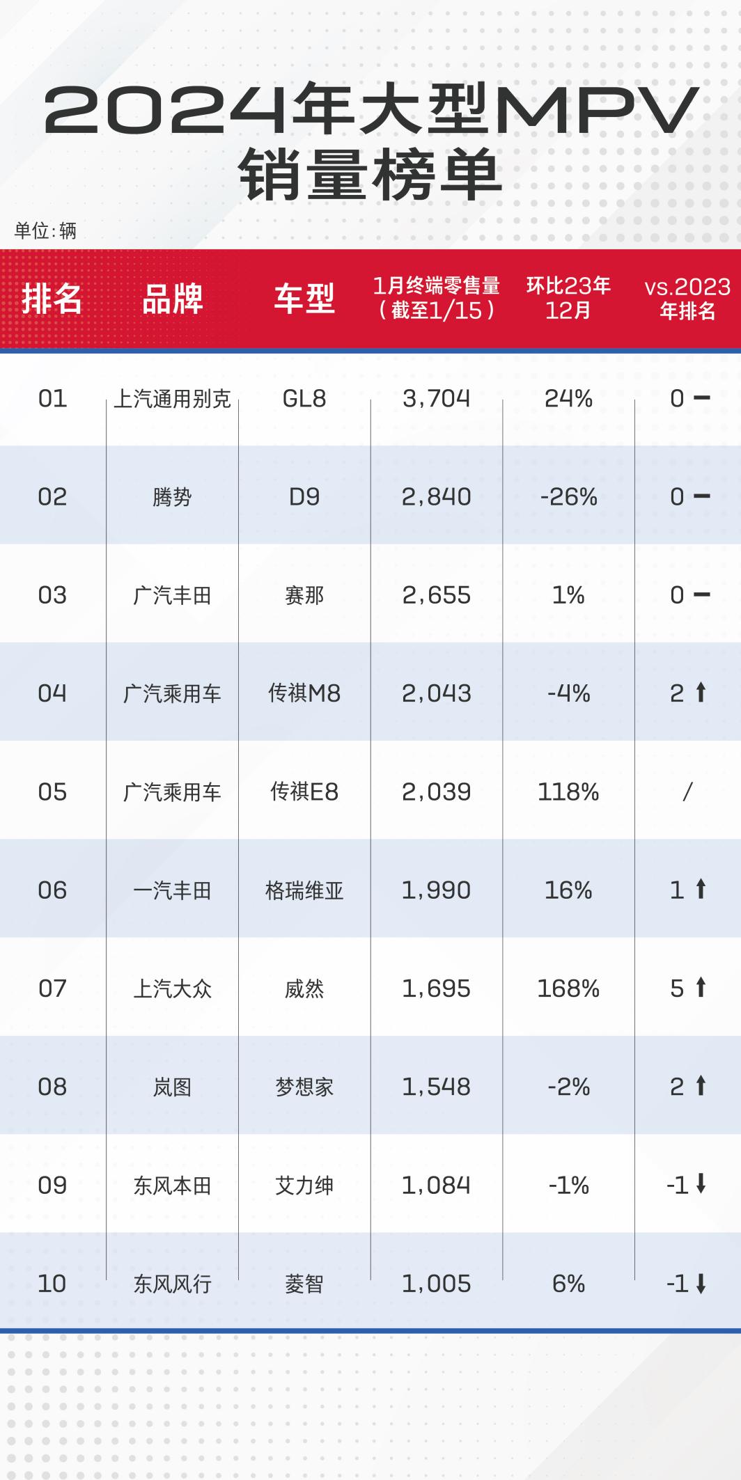 数据是别克GL8展现强大竞争力最好的证明。2023年全年,别克GL8交出了118906辆的销量成绩单,位居MPV终端销量排行榜第一名,领先第二名腾势D9多达1.6万辆。进入2024年之后,别克GL8延续了一贯以来的稳健表现,1月上半月终端零售量达到3704辆,环比增长24%,超出身后的腾势D9、丰田赛那近1千辆,继续问鼎大型MPV销量排行榜榜首。