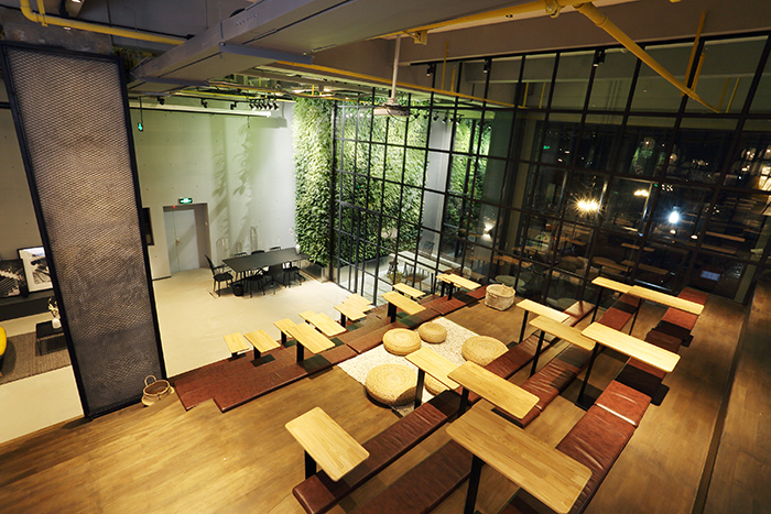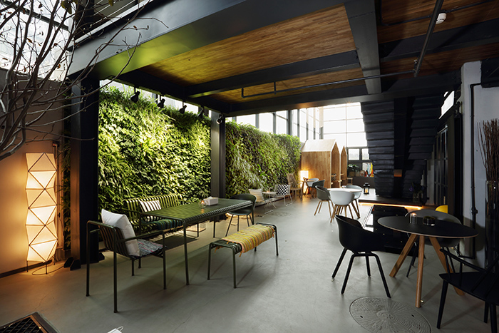 为了提供干净的空气并让室内工作者们有机会感知自然,Ideapod 在室内使用新风系统,还引入了源自新加坡的生态绿植墙。空间内共有垂直面积达70平方米的绿植墙,采用先进技术无土栽培了多种类自然植物,这些可以进行光合作用的鲜活植物为空间提供了阳光花园房般的存在。