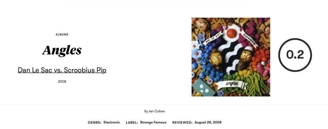 2008 年,制作人Dan Le Sac获得了0.2/10分的评价,但他认为:“Pitchfork 被毁对世界各地的音乐家来说都是一个净负面影响。我作为一个(可能)拥有该网站最低评分的人,这么说可一点都不虚伪。”