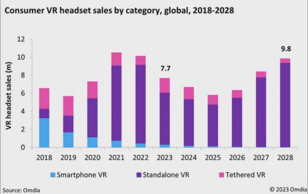 根据海外市场调研机构Omdia的研究显示,2023年消费级VR市场出现严重下滑,头显销量下降24%,从2022年的1010万部暴跌至770万部;预计2024年和2025年将进一步下降13%。
