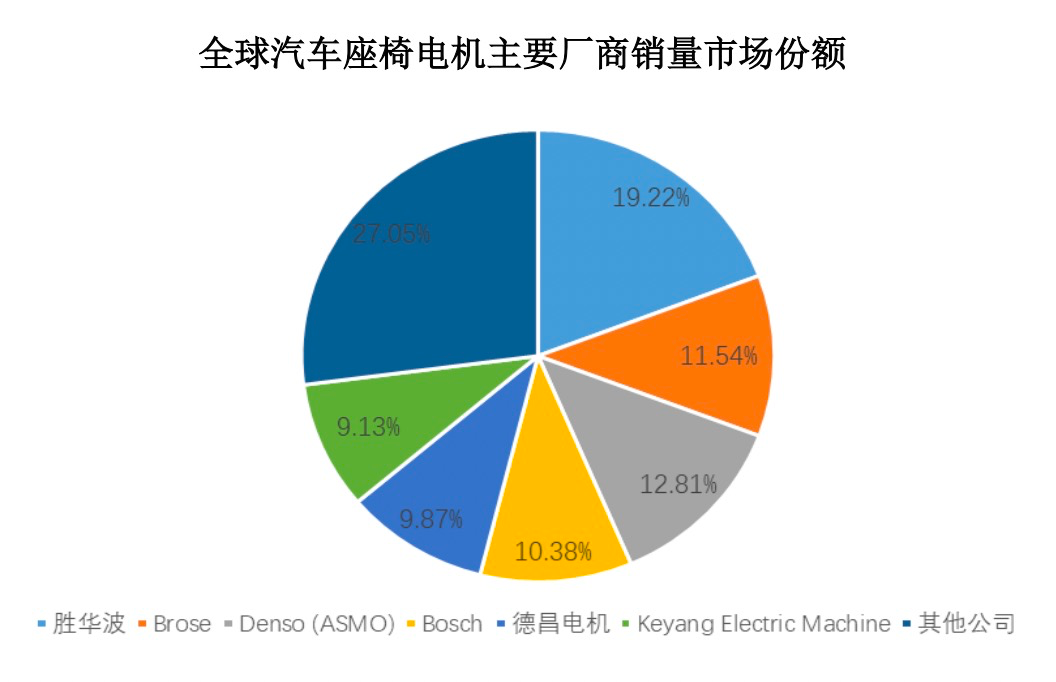 座椅电机是实现汽车座椅电动控制,为调节座椅提供动力的电机。在座椅电机制造领域,胜华波是全球主要的汽车座椅电机供应商。根据QY Research的统计数据,2022年胜华波汽车座椅电机销量排名全球第一,市场份额达19.22%。