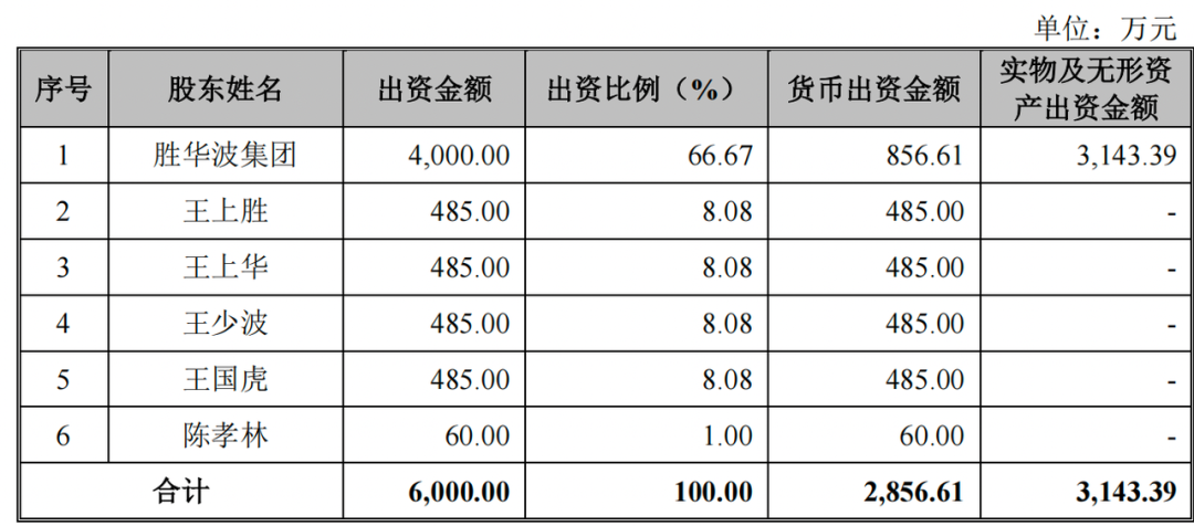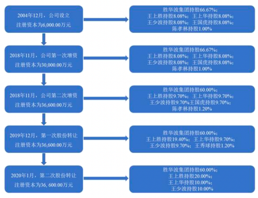 胜华波成立于2004年,由胜华波集团、王上胜、王上华、王少波、王国虎和陈孝林共同出资发起设立,其中,王上胜、王上华、王少波三人为兄弟关系,公司设立时的注册资本为6000万元。