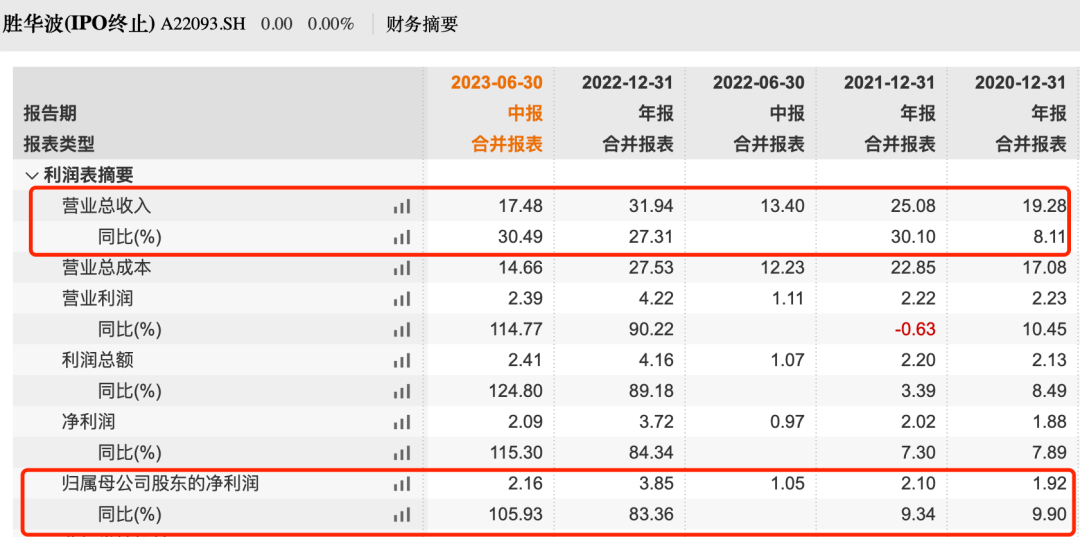 公开资料显示,2020年-2023年上半年(以下简称“报告期”),胜华波的营业收入分别为19.28亿元、25.08亿元、31.94亿元、17.48亿元,同比增长率分别为8.11%、30.10%、27.31%、30.49%;同期归母净利润分别为1.92亿元、2.10亿元、3.85亿元、2.16亿元,同比增长率分别为9.90%、9.34%、83.36%、105.93%。