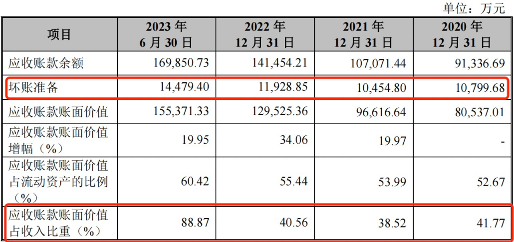 不仅如此,报告期各期末,公司应收账款坏账准备金额分别为1.08亿元、1.05亿元、1.19亿元、1.45亿元,2022年和2023年上半年,公司的坏账金额快速增长。