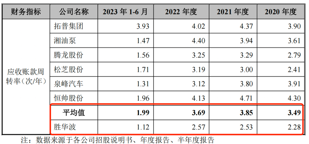此外,胜华波应收账款周转率(次/年)分别为2.28、2.53、2.57、1.12,而同行可比公司的应收账款周转率均值分别为3.49、3.85、3.69、1.99,一直高于胜华波。