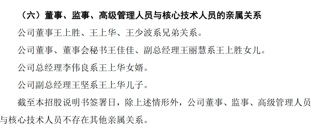其中,王上胜、王上华、王少波均为董事;董事、董事会秘书王佳佳、副总经理王丽慧均是王上胜女儿,总经理李伟良系王上华女婿,副总经理王坚系王上华儿子。
