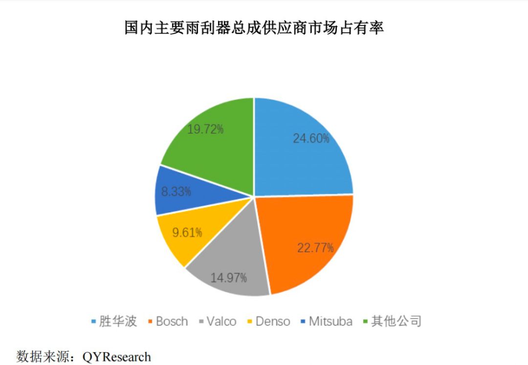 汽车雨刮器总成的主要作用是清除汽车玻璃上的雨水、霜雪和泥土灰尘等,使驾驶员的视线清晰,保障车辆行驶安全。在雨刮器总成领域,目前国内主要的生产商包括胜华波、博世、法雷奥、电装、三叶、贵阳万江等。根据QY Research的统计数据,胜华波2022年雨刮器总成销量约占国内整车配套市场的24.60%,排名第一。