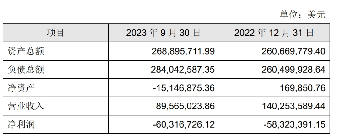 截至2023年三季度末,鲁班比项目还是资不抵债的状态,净资产为-1514.69万美元,2022年以来累计收入为2.3亿美元,净亏损却高达1.19亿美元。