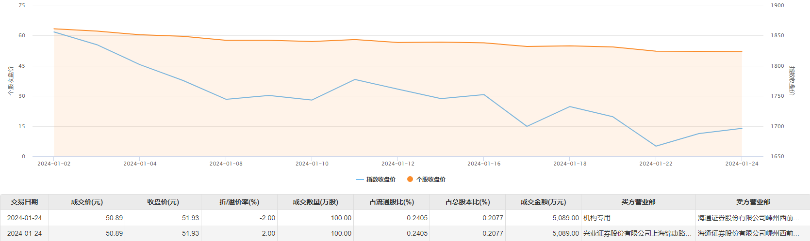 1月24日,北京君正今日大宗交易成交200万股,成交额1.02亿元,占当日总成交额的16.4%,成交价50.89元,较市场收盘价折价2.0%。