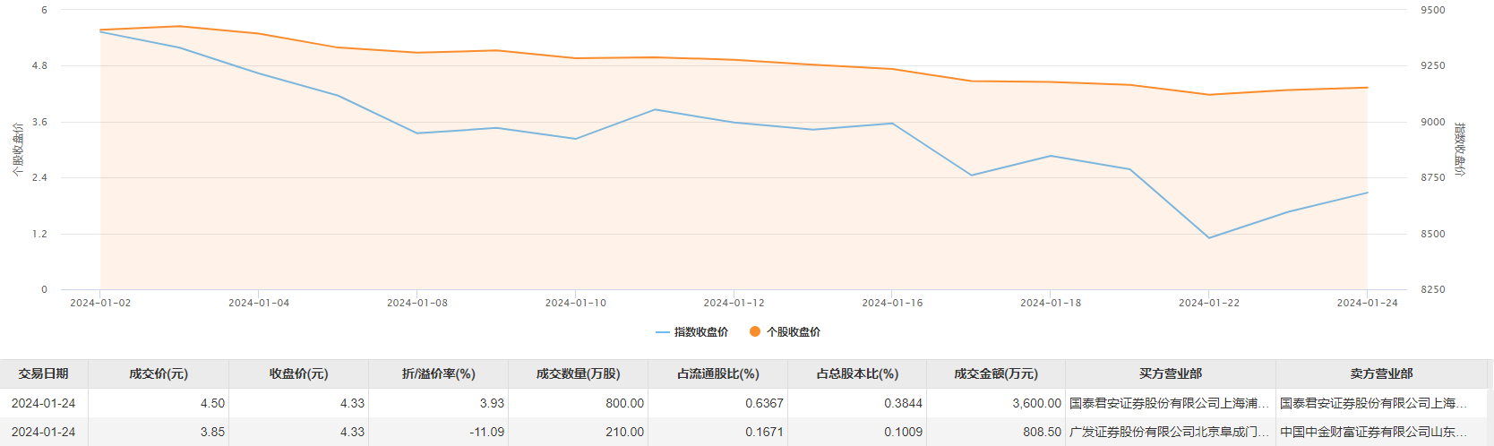 1月24日,融发核电今日大宗交易成交1010万股,成交额4408.5万元,占当日总成交额的40.89%,成交均价4.36元,较市场收盘价溢价0.69%,其中最高成交价4.5元,最低成交价3.85元。