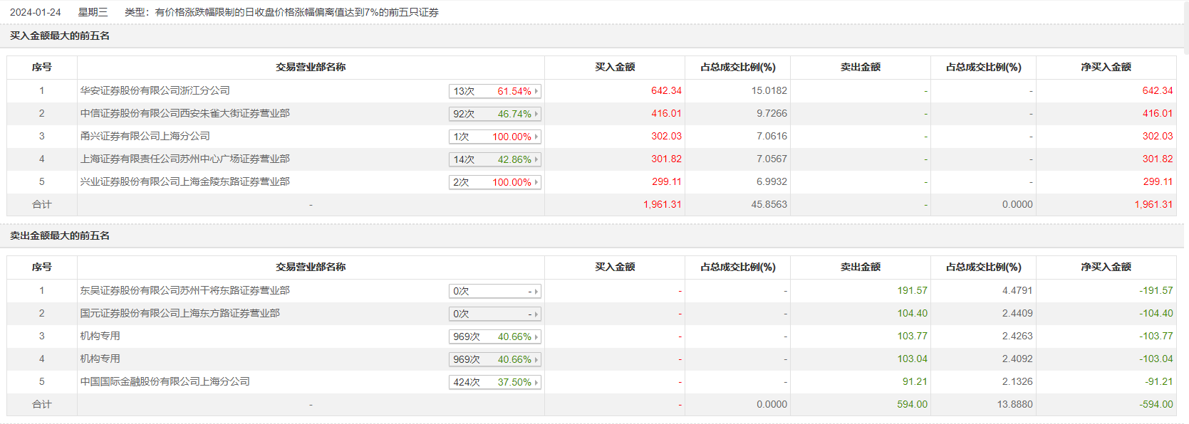 1月24日,中华企业今日涨停,龙虎榜数据显示,上榜营业部席位全天成交2555.31万元,占当日总成交金额比例为59.74%。其中,买入金额为1961.31万元,卖出金额为594.0万元,合计净买入1367.3万元。