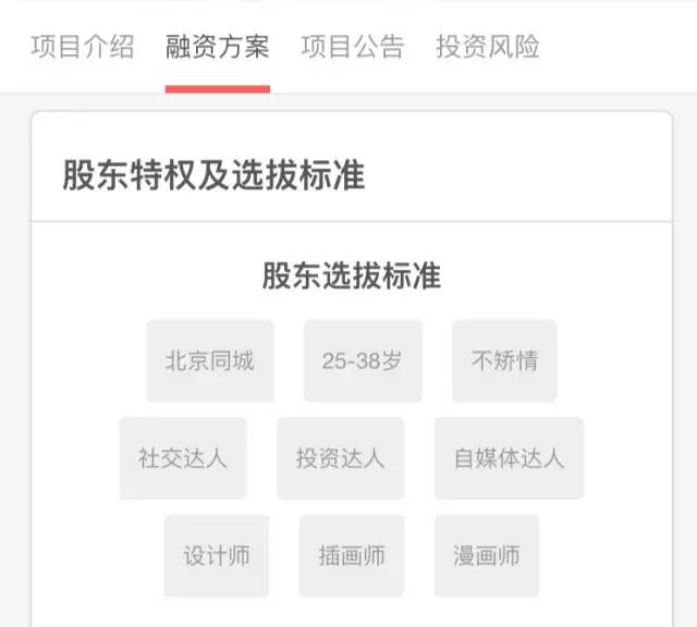 除了为餐厅导流外,秦枫非常注重股东背后的社会资源。秦枫对股东的个人身份有着严格的甄选,以和靠谱投合作众筹为例,在“股东选拔标准”一栏里,“社交达人”、“自媒体达人”、“插画师”、“漫画师”等标签被清晰的标注出来。