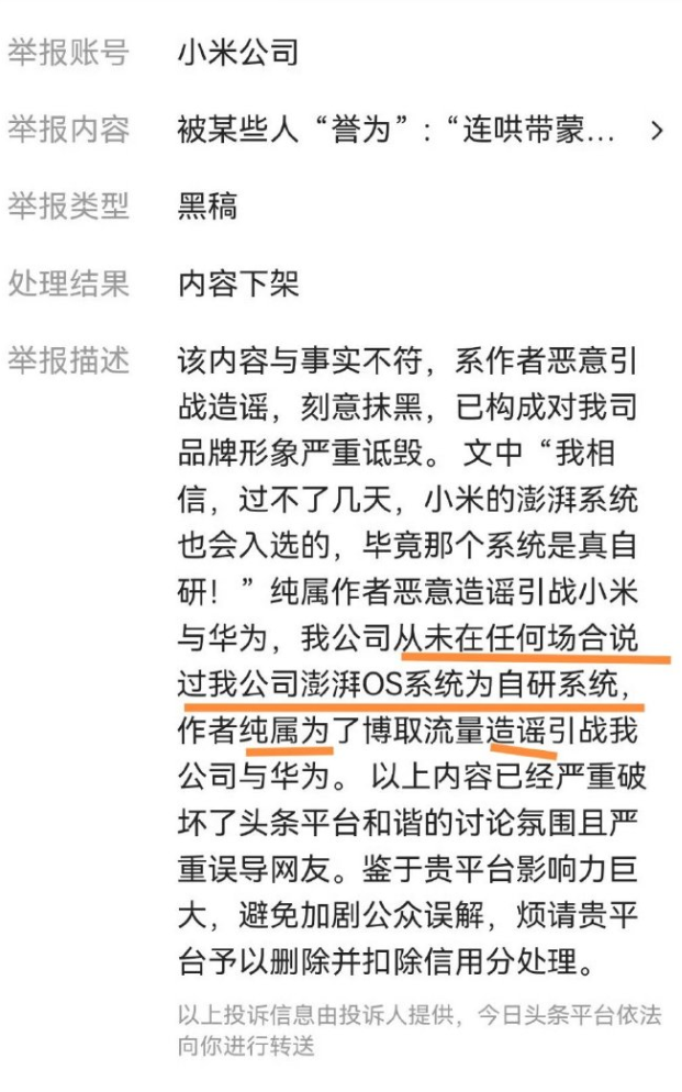 “差评”在《小米说澎湃OS不是自研?网友这两天吵成一锅粥》一文中介绍,最近两天,有博主发现,小米在今日头条平台举报了一篇名为《 被某些人“誉为”:“连哄带蒙 ”...》的文章,说这篇文章 “ 恶意造谣 ”、“ 刻意抹黑 ”、“ 严重诋毁 ”。