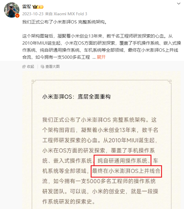 而且雷军在自己发布的笔记中也提到过,澎湃OS 中包含了 “ 纯自研通用操作系统”。