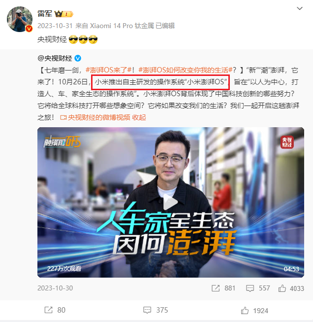 因为在之前央视财经发布一篇 “七年磨一剑,澎湃OS来了”的报道中,微博文案中使用了 “ 自主研发操作系统小米澎湃OS ” 的措辞,并获得了雷军的快乐转发。