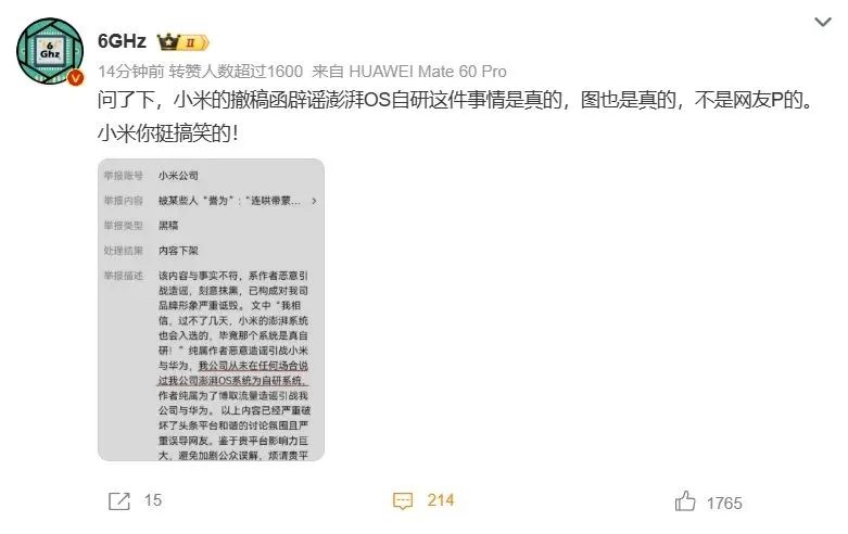 严格来说,举报本身是小米的权利,没有问题。有意思的地方在于,举报描述里所说的 “我公司从未在任何场合说过澎湃OS系统为自研系统,以上内容严重误导网友”,这个理由,有那么点站不住脚。