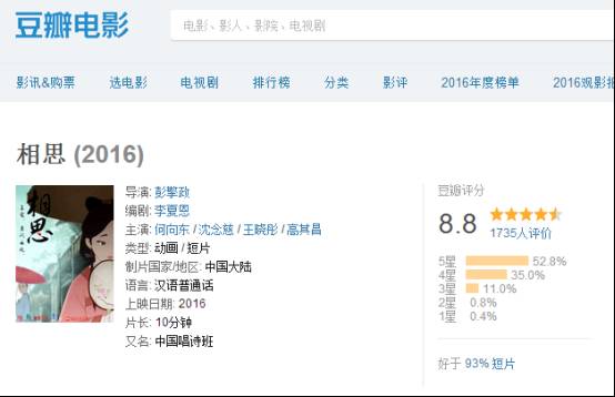 当古典文学里的爱情遇上中国风,是如此这般缠绵凄怆。虽然剧情不甚新颖,但它以古朴细腻的画风,精巧有深意的细节,迅速得到了网友们的一致好评。豆瓣评分高达8.8分,许多大V纷纷转发,称“看到了国漫的正确打开方式。”让不少粉丝将这部短片称作中国风动漫短片、冠以国漫复兴的名号。