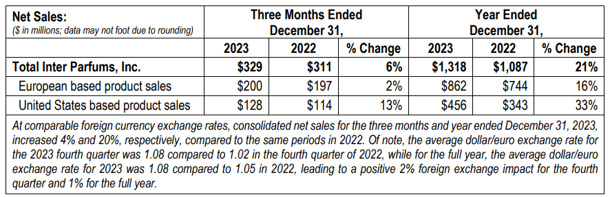 纽约时间1月23日,法国香水公司依特香水Inter Parfums在官网公布了截至2023年12月31日的三个月(2023年10月1日-2023年12月31日)和2023年全年的业绩报告。