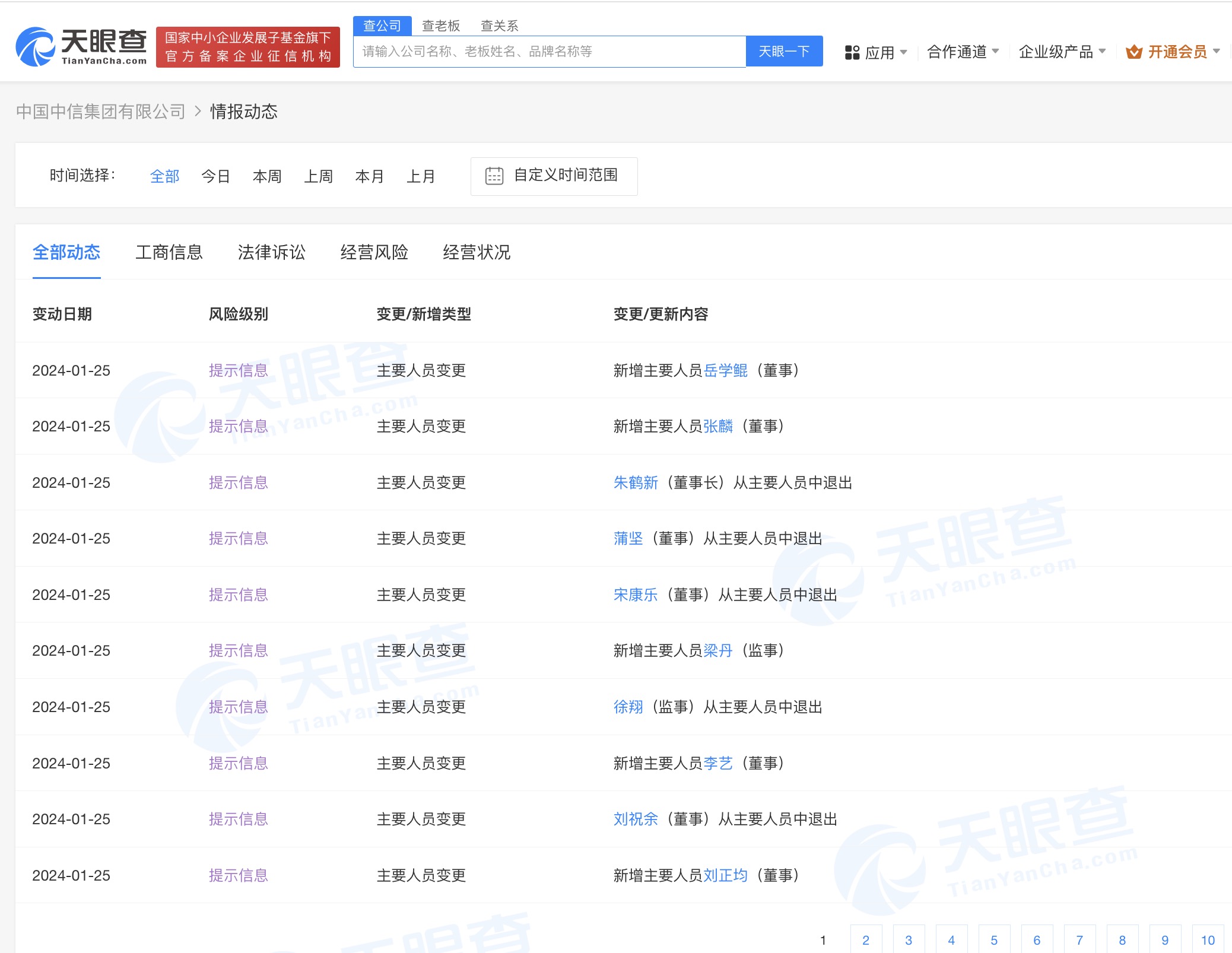 天眼查显示,1月25日,中国中信集团有限公司发生工商变更,朱鹤新卸任法定代表人、董事长,由奚国华接任,同时,公司多位主要人员发生变更。