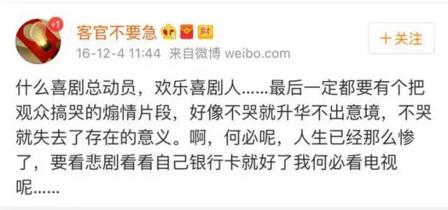 据说,最好的喜剧一定是悲剧。当一个国家里民众对喜剧的需求不那么强烈,这个国家才算真正的发达。大概满屏的综艺笑声是媒体为大众编造的梦境,无数的人们无尽的远方都在这笑声里被忘却。可没有笑料的刻意煽情,是不是有点矫枉过正?