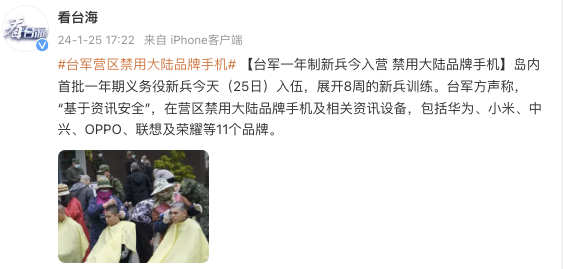 @看台海 微博消息,岛内首批一年期义务役新兵今天(1月25日)入伍,展开8周的新兵训练。台军方声称,“基于资讯安全”,在营区禁用大陆品牌手机及相关资讯设备,包括华为、小米、中兴、OPPO、联想及荣耀等11个品牌。