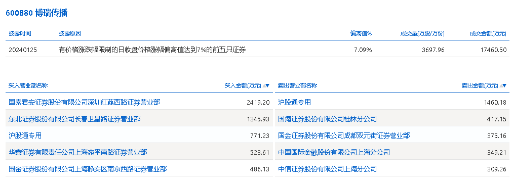 1月25日,博瑞传播今日涨停,全天换手率3.38%,成交额1.75亿元,振幅8.89%。龙虎榜数据显示,沪股通净卖出688.95万元,营业部席位合计净买入3324.10万元。上交所公开信息显示,当日该股因日涨幅偏离值达7.09%上榜。