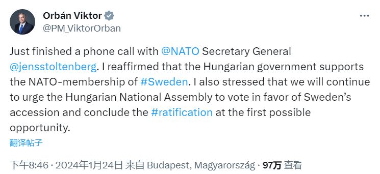 匈牙利总理欧尔班周三在X平台发文,称其与北约秘书长斯托尔滕贝格通话时表明匈牙利政府支持瑞典加入北约。之后,欧尔班将敦促匈牙利议会投票,尽快完成对瑞典的入约批准。