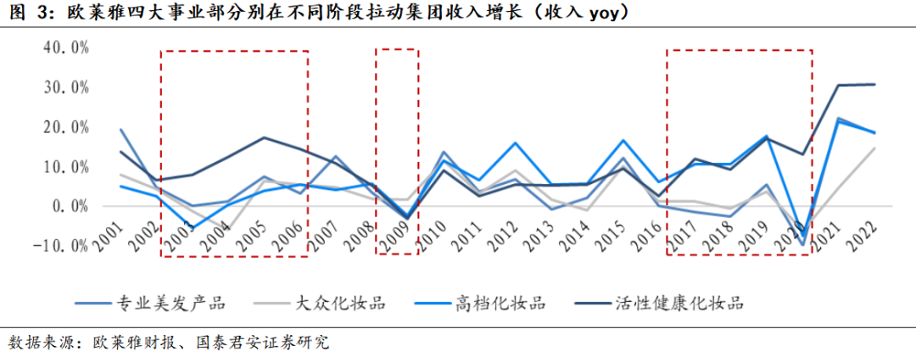 从欧莱雅的业绩曲线来看,从2021年开始,拉动集团增长的主要力量从高端化妆品交棒至活性健康化妆品(2023年更名为皮肤医学美容部)部门,广为大众所知的功效护肤品牌理肤泉、薇姿、适乐肤、修丽可同属这一部门。