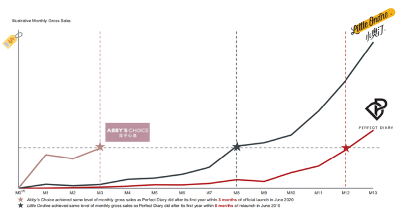 小奥汀在重新启动后的第8个月,即达到完美日记第12个月销售额水平,完子心选则将这一时间缩短至第3个月 资料来源:逸仙电商招股书