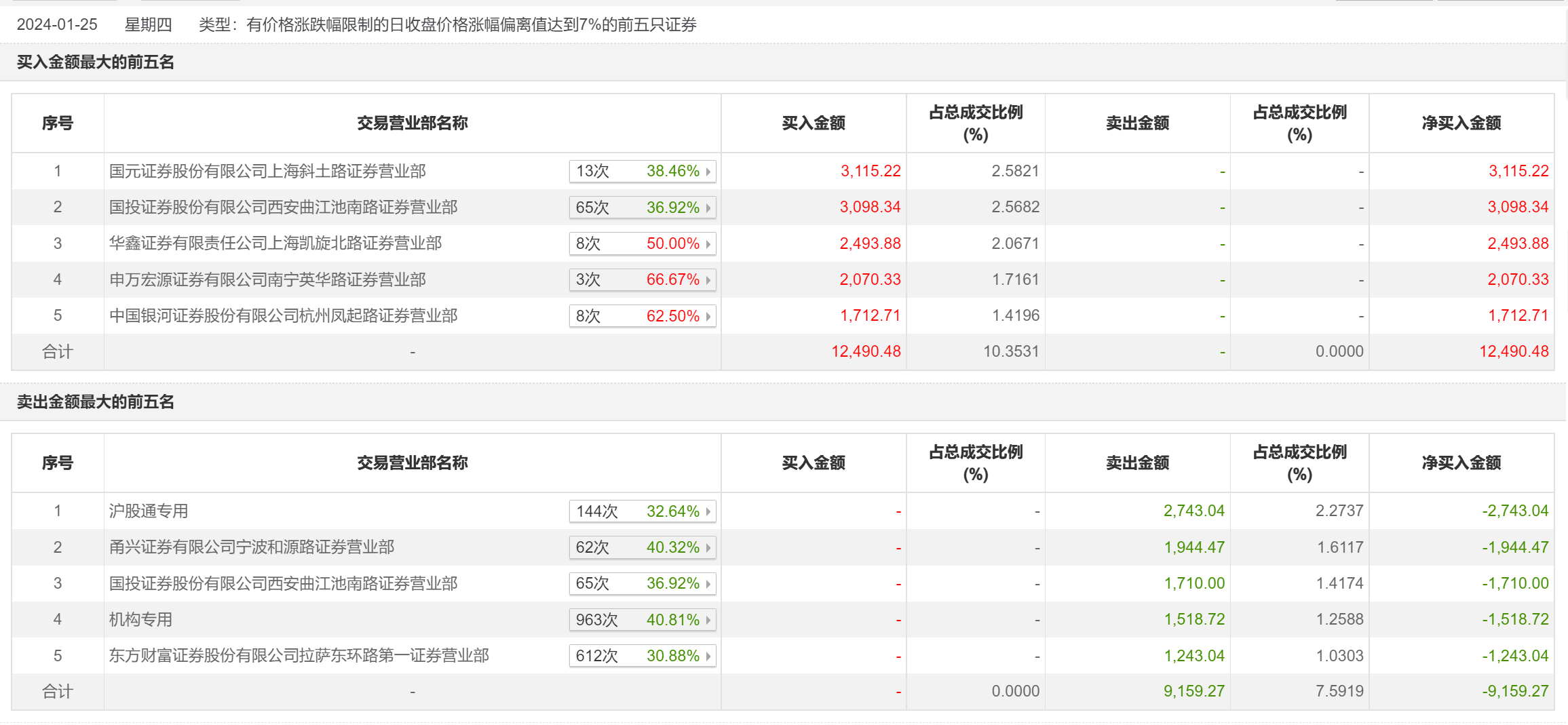 1月25日,中航产融今日涨停,全天换手率达4.05%,振幅达9.52%。龙虎榜数据显示,营业部席位合计净买入3331.21万元。其中,机构合计净卖出1518.72万元。此外,国元证券上海斜土路证券营业部、国投证券西安曲江池南路证券营业部分别买入3115.22万元、3098.34万元;沪股通专用、甬兴证券有限公司宁波和源路证券营业部分别卖出2743.04万元、1944.47万元。