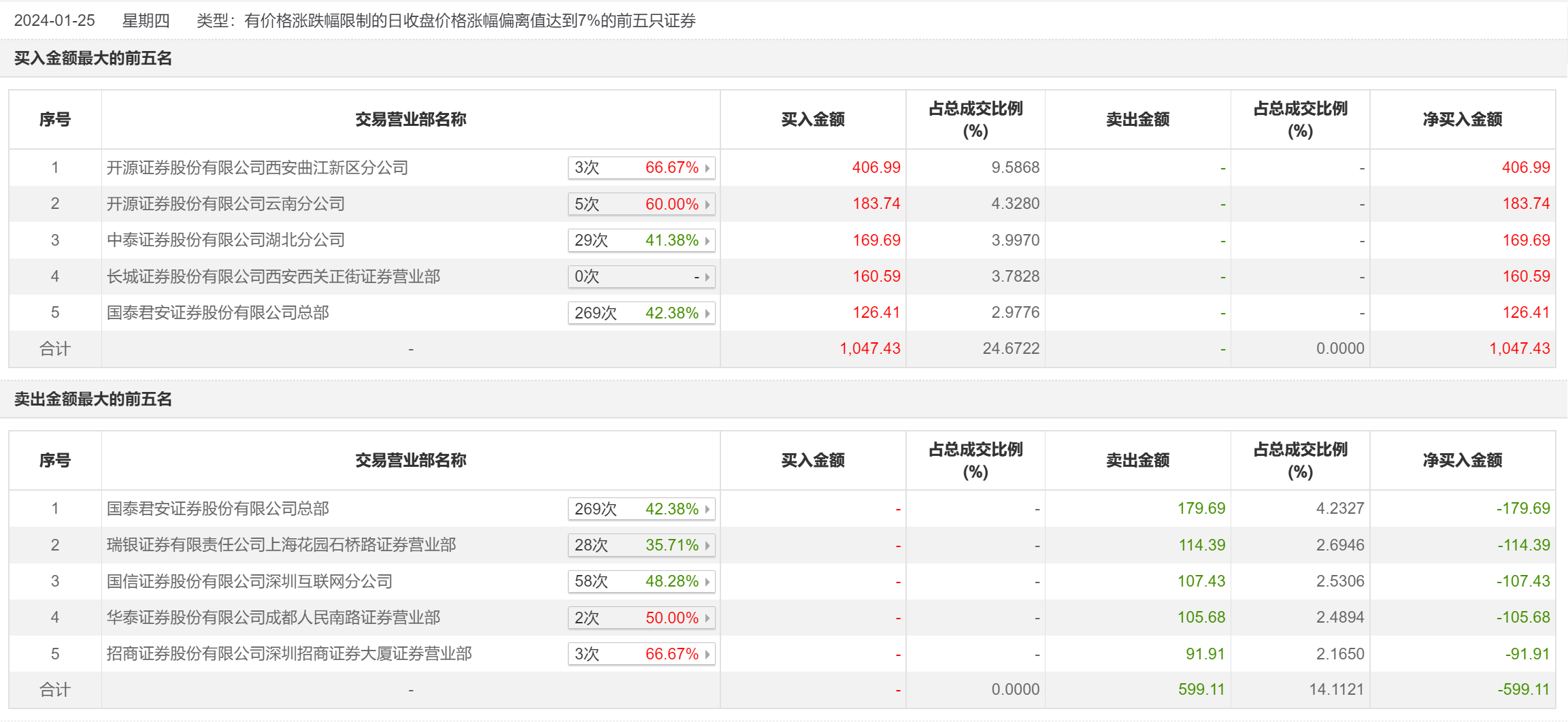 1月25日,京能置业今日涨停,全天换手率达1.97%,振幅达9.66%。龙虎榜数据显示,营业部席位合计净买入448.31万元。其中,开源证券西安曲江新区分公司、开源证券云南分公司分别买入406.99万元、183.74万元;国泰君安证券总部、瑞银证券上海花园石桥路证券营业部分别卖出179.69万元、114.39万元。