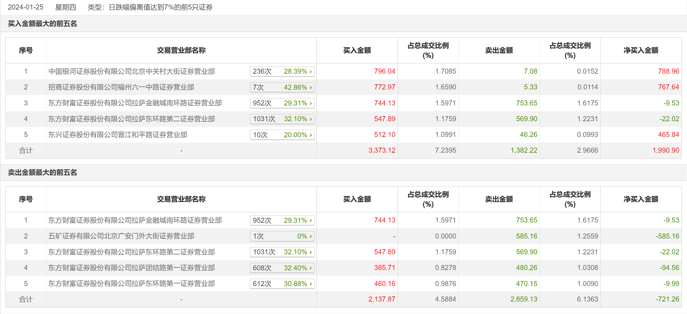 1月25日,华瓷股份今日跌停,全天换手率达43.15%,振幅达3.69%。龙虎榜数据显示,营业部席位合计净买入1301.19万元。其中,东方财富证券拉萨金融城南环路证券营业部、五矿证券有限公司北京广安门外大街证券营业部分别卖出753.65万元、585.16万元;中国银河证券北京中关村大街证券营业部、招商证券福州六一中路证券营业部分别买入796.04万元、772.97万元。