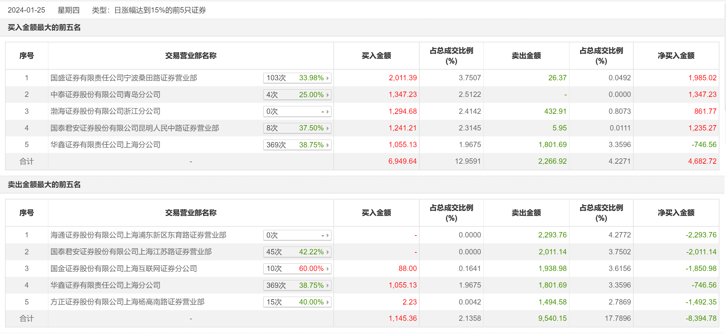 具体来看,知名游资现身龙虎榜,宁波桑田路(国盛证券宁波桑田路证券营业部)、中泰证券青岛分公司分别买入2011.39万元、1347.23万元;海通证券上海浦东新区东育路证券营业部、章盟主(国泰君安证券上海江苏路证券营业部)分别卖出2293.76万元、2011.14万元。