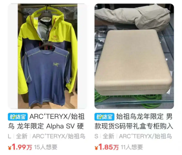 而原价8200元的始祖鸟“龙年限定”冲锋衣,如今已经在二手平台被炒到近两万元,溢价远超一倍。