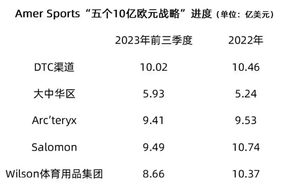 早在收购亚玛芬之初,安踏就提出了野心勃勃的“五个10亿欧元”的目标,即将始祖鸟、萨洛蒙和Wilson三个品牌打造成“10亿欧元”品牌,另外分别通过中国市场和直营模式实现10亿欧元的收益。