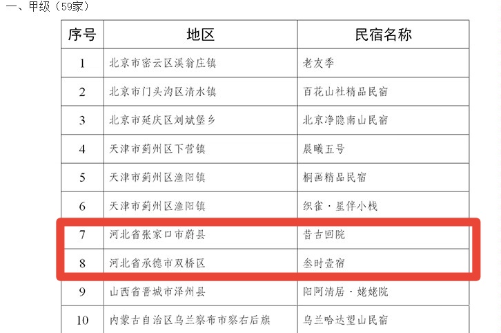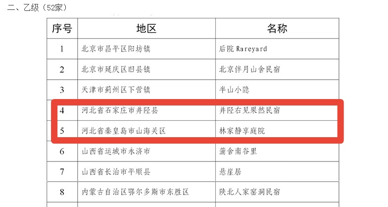 河北省张家口市蔚县的昔古回院、河北省承德市双桥区的叁时壹宿,符合全国甲级旅游民宿标准;河北省石家庄市井陉县的井陉右见果然民宿、河北省秦皇岛市山海关区的林家静享庭院符合国乙级旅游民宿标准。