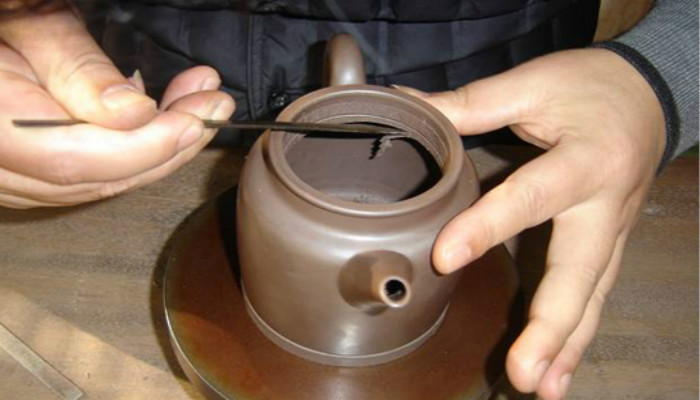 ——从壶内泥片接头判断。纯手工壶是由泥片打平后,根据壶的形状切好后围成壶身(也叫身筒),所以壶的身筒上会有泥片接头。这个接头从壶的外面是看不出来的,一定要从壶里看。