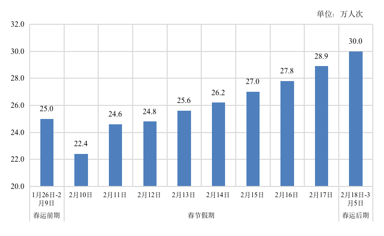 铁路、民航客运量预计呈“前低后高”态势,大年初一当天客运量最低,随后逐步增加,春运后期(2月18日至3月5日)日均客运量仍保持高位运行。民航客运942.4万人次,日均约23.6万人次,较2023年增长12.4%。大年初一当天客运量最低,春运后期日均客运量达到最高,后逐步降至日常水平。