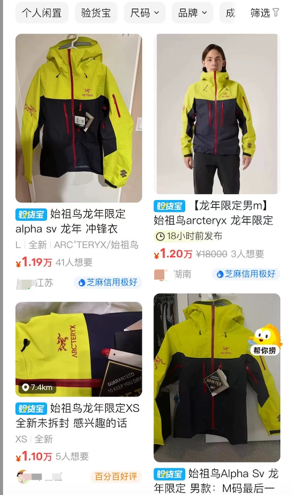 在二手交易平台上,这款原始售价8200元的始祖鸟“龙年限定”已经被炒到了12000元以上,#始祖鸟龙年冲锋衣炒到12000元#冲上微博热搜。