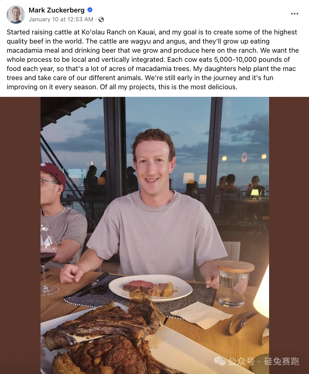 但小扎似乎并没有被恶评干扰,仍在自己的“世外桃源”内大布局,就在新年年初,他在自己的Facebook上发推宣布将在这一农场内开启一个全新的养殖计划,目标是生产世界上最优质的牛肉,在农场内产出的澳洲坚果和啤酒将是这些和牛和安格斯牛的主要饮食,每头牛每年要消耗5000到10000 磅的食物,这意味着他要在农场内种植大量的坚果来保证其食物供给,推文上还附加了一张他开心吃牛肉的照片