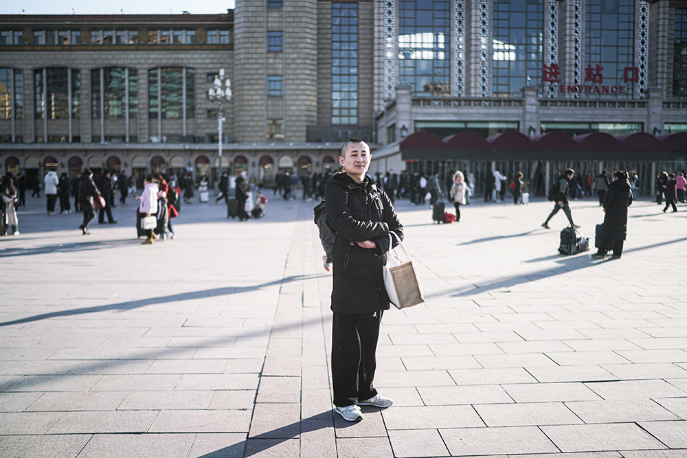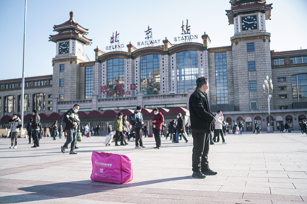 老陈携带的唯一行李是一只粉色袋子,因为嫌候车室太闷,他选择站在广场上等老乡晚上过来一起聚餐,然后再坐火车回山东济宁的老家。44岁的老陈在北京一处工地上工作,已经有七、八年的时间。他曾觉得“来大城市看看挺好”,但后来每周休息的两天时间里,他很少出门,只是在宿舍里“洗洗衣服、锻炼身体”。几位老乡是他在北京仅有的朋友,他们一年聚会一两次,总是一起吃山东菜,喝北京的二锅头。饭桌上,他们会聊工作,但很少聊到在北京的生活。来北京之前,老陈在广东卖鞋,不过,不管在什么地方工作,他几乎年年都回家。“我觉得和家人团聚最重要,也舍不得老人。我回家的行李一直是这么简单,简单生活多好。”老陈说。