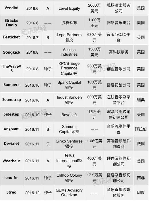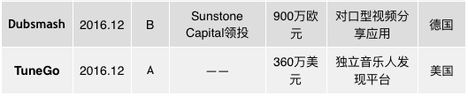 2016年12月消息,独立音乐人发现平台TuneGo已宣布完成360万美元的A轮融资,交易具体信息未公布。