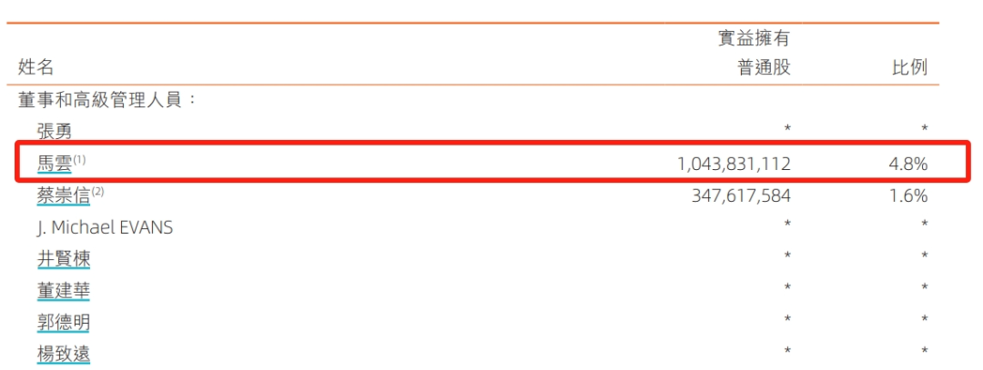 阿里提交美股《招股书》时,马云持股比例是8.9%;重返港交所时,马云持股比例为6.1%。2020年7月,马云持股比例最后一次出现在阿里财报中时,已降至4.8%。