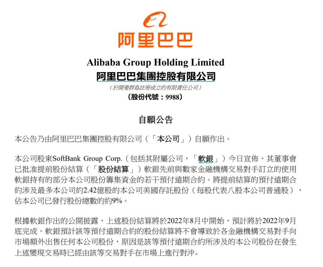 作为对比,2022年8月,阿里曾披露另一份软银提前结算若干预付远期合约的公告,涉及至多约2.42亿股ADR,占阿里已发行总股本的9%。