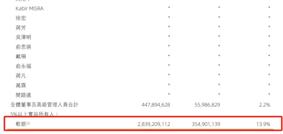 但一方面,阿里年报中标注了马云、蔡崇信拥有的股份是各自直接持有,可以用于单独计算;另一方面,如果软银集团的持股比例真的降至0.5%以下,那显然无论是单算还是合算,都要少于马云、蔡崇信任意一人。