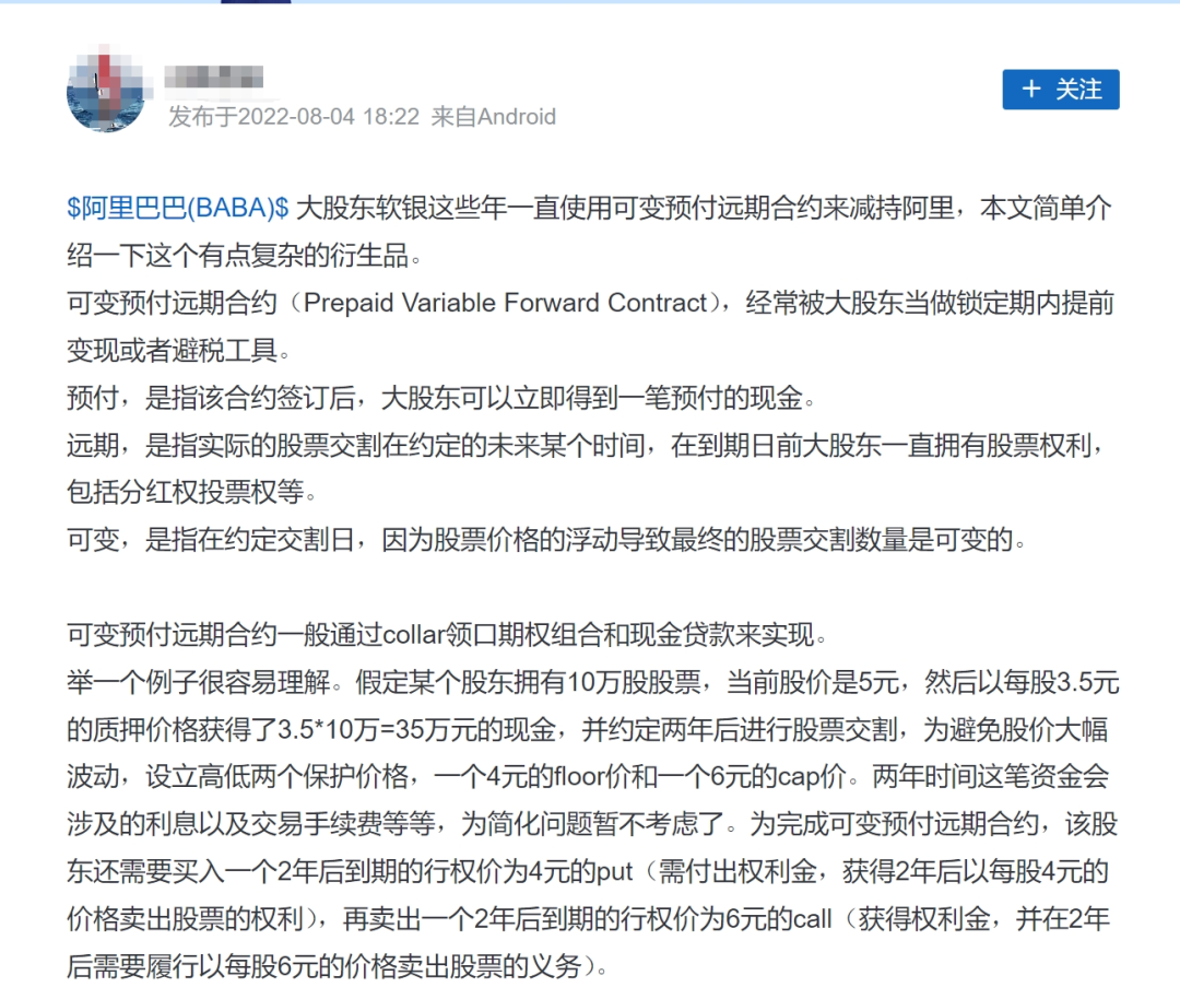 雪球上有投资者曾对“预付远期合约”进行科普,称其经常被大股东当作锁定期内提前变现或避税工具,用来降低股价大幅波动给自己造成的损失。